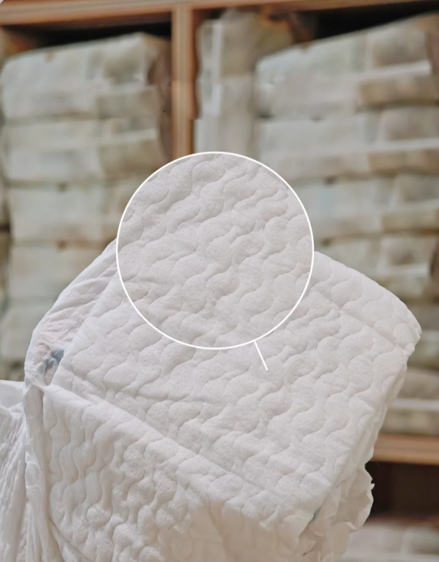 Crafted by our factory with sophisticated production technology the bionic 3D willow pattern perforated top sheet features double sided fleece texture which minimizes skin friction and avoids red marks on baby delicate skin. The scientific perforated structure greatly improves air permeability and urine diversion efficiency keeping baby skin dry for a long time and fundamentally solving the winter rash problem that the global market cares about.